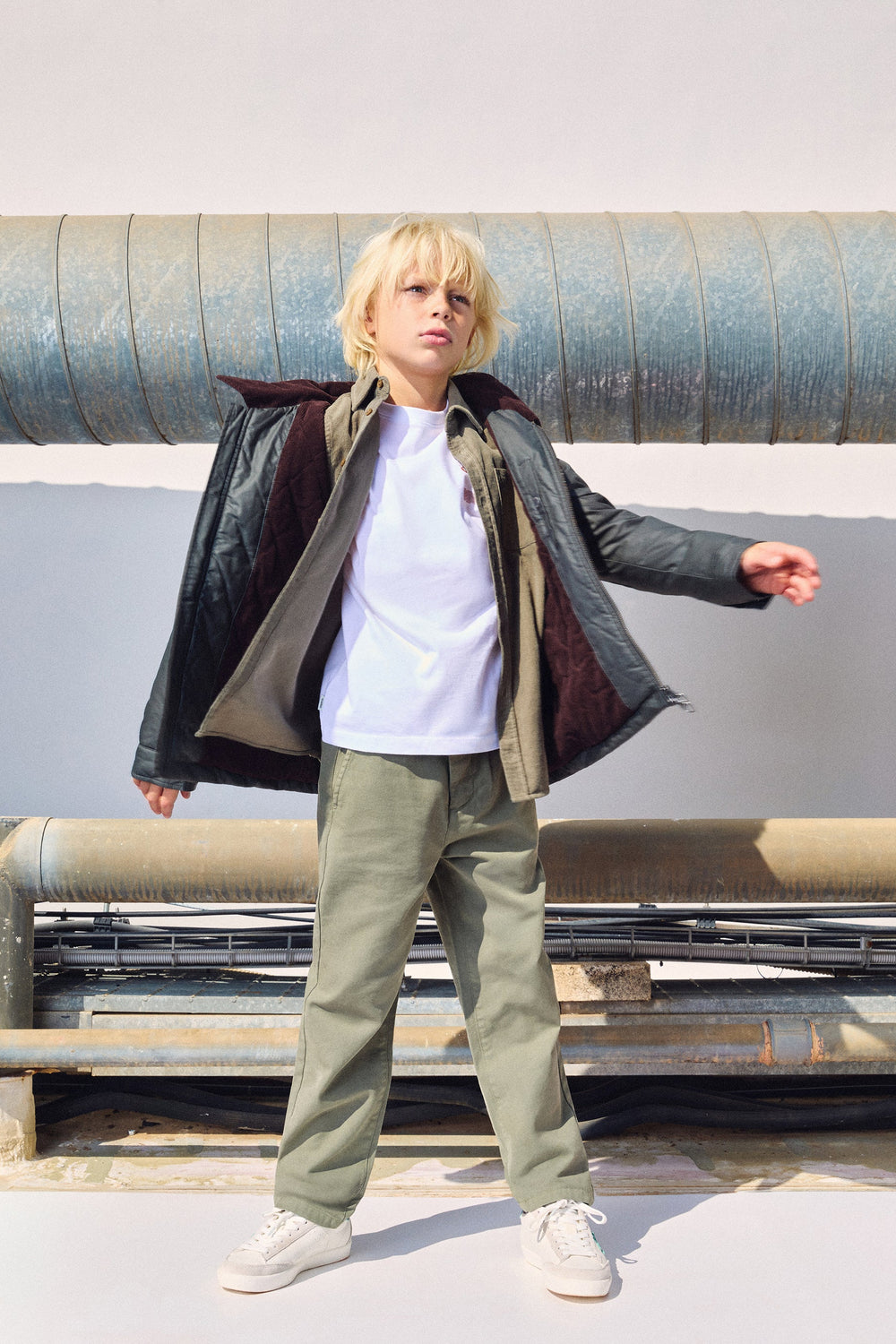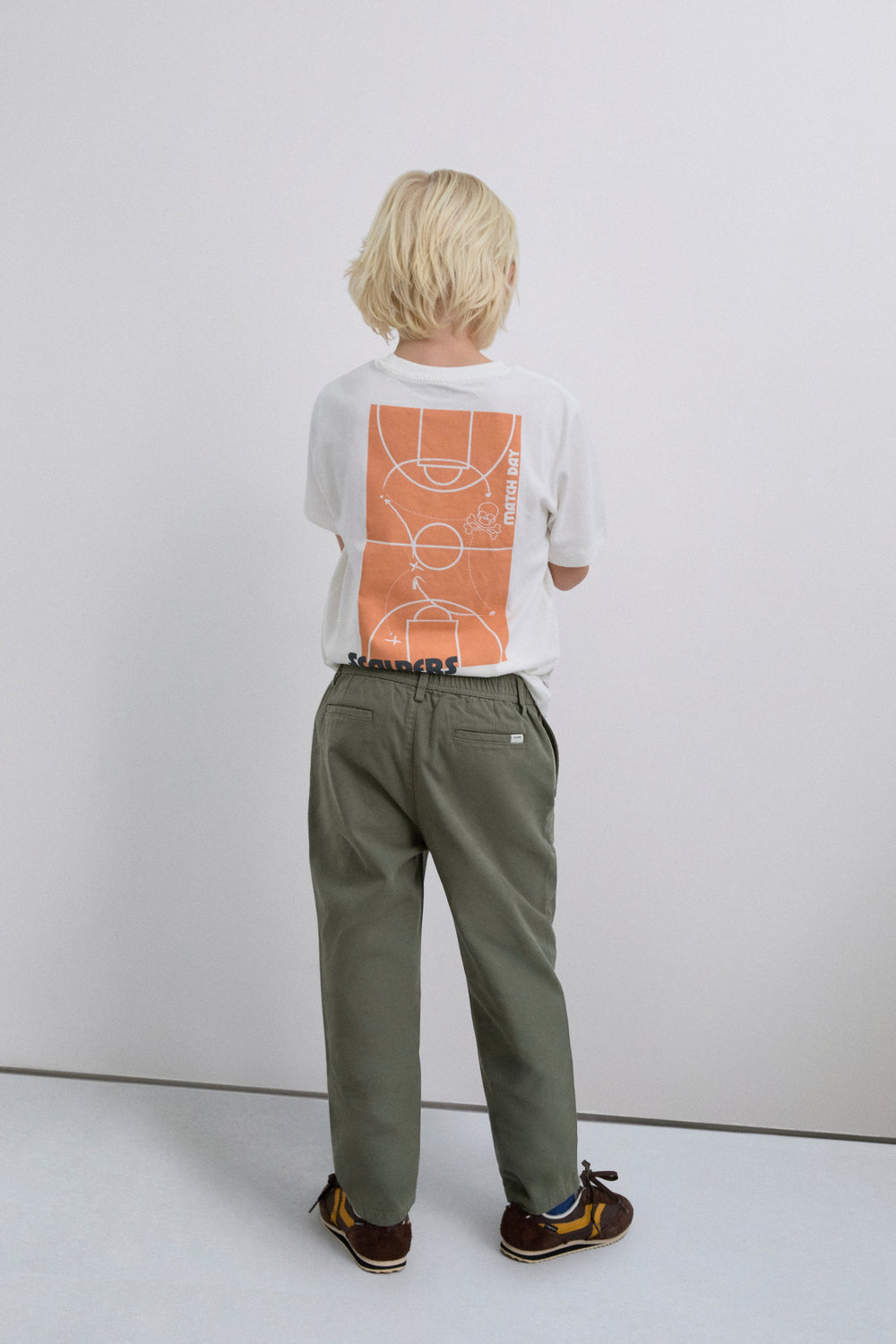 Chino trousers made of 100% BCI cotton. Two front and back pockets. Button fastening and belt loops. Logo label detail on the pocket.