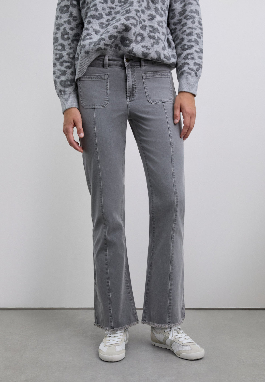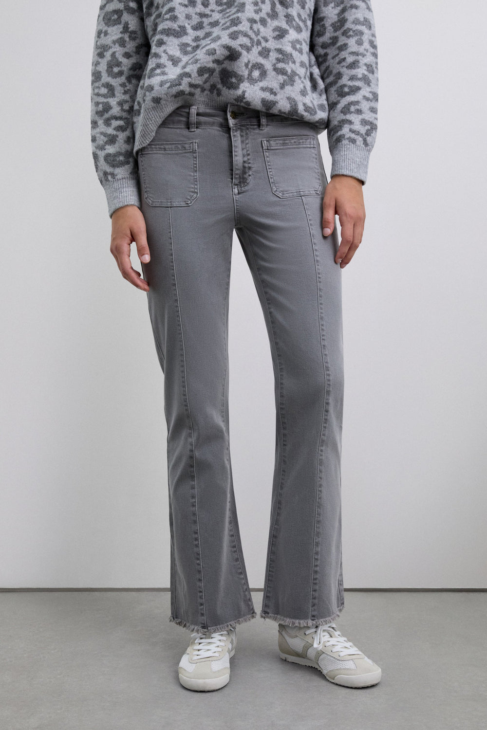 Flared trousers made of BCI cotton. Button and zip fastening. Belt loops at the waist. Front and back pockets. Seam detail on the front. Side slit and frayed hems.