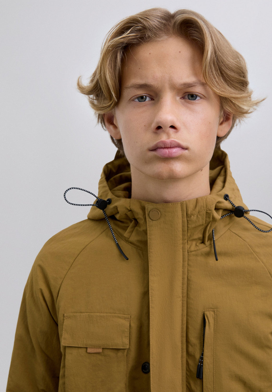 Long sleeve jacket with adjustable drawstring hood. Four front pockets: two on the chest and two lower flap pockets. Front button and zip fastening. Contrast rubber logo patch detail and skull on the sleeve.