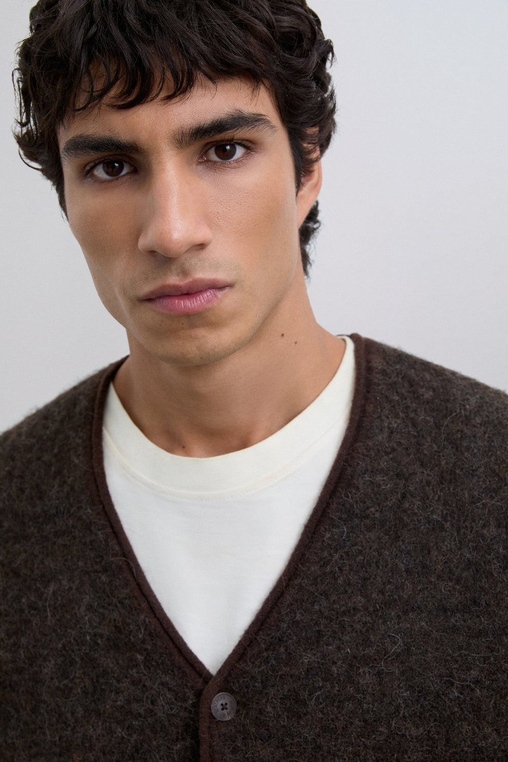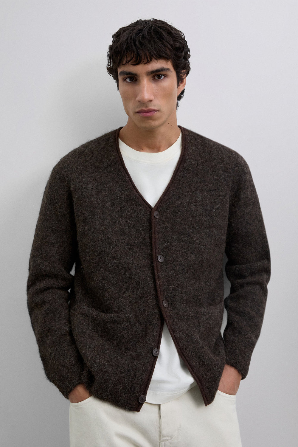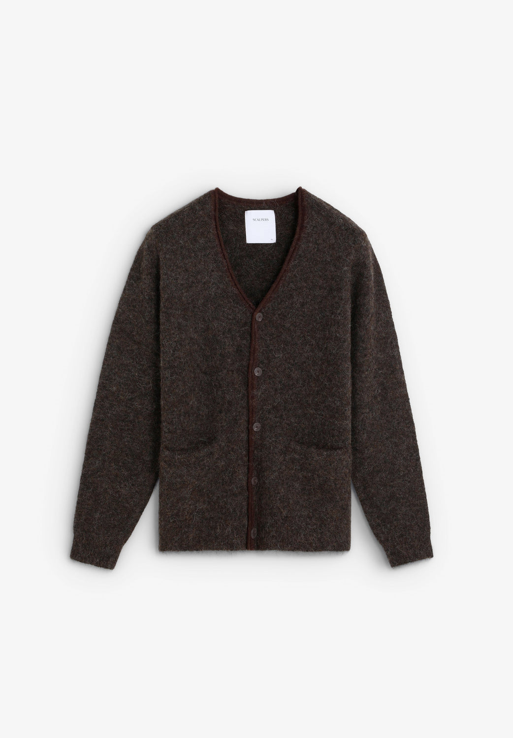 Alpaca vest. V-hals. Lange mouwen. Knoopsluiting voor. Twee zakken aan de voorkant. Label met logo aan de binnenkant.