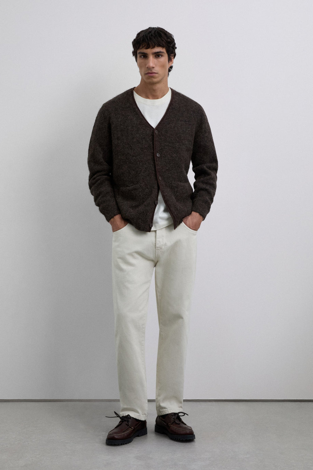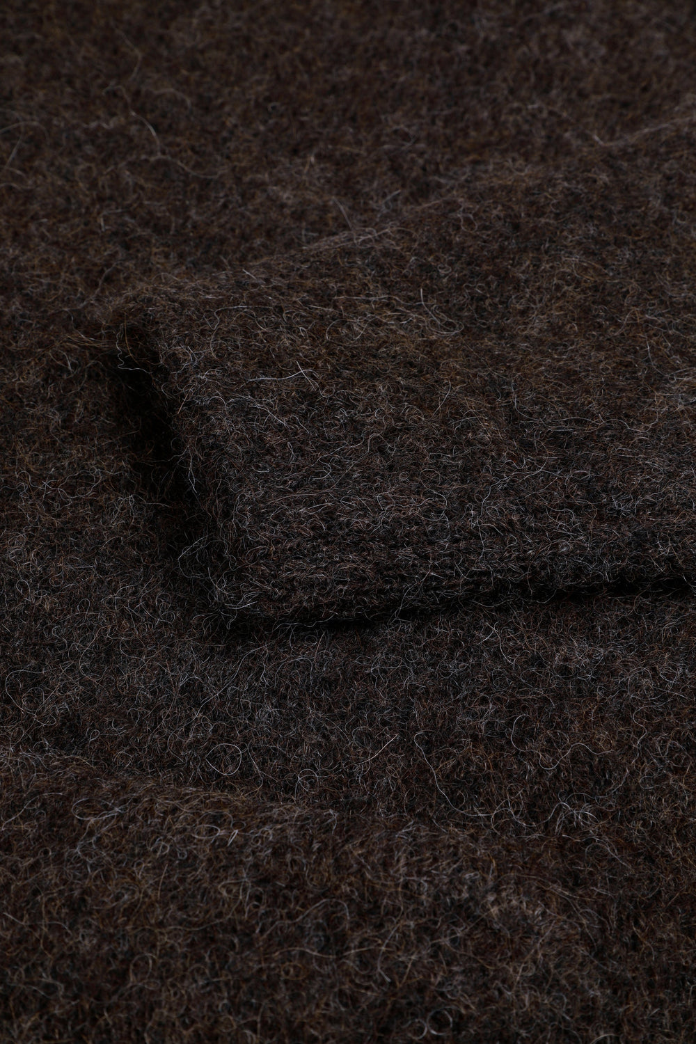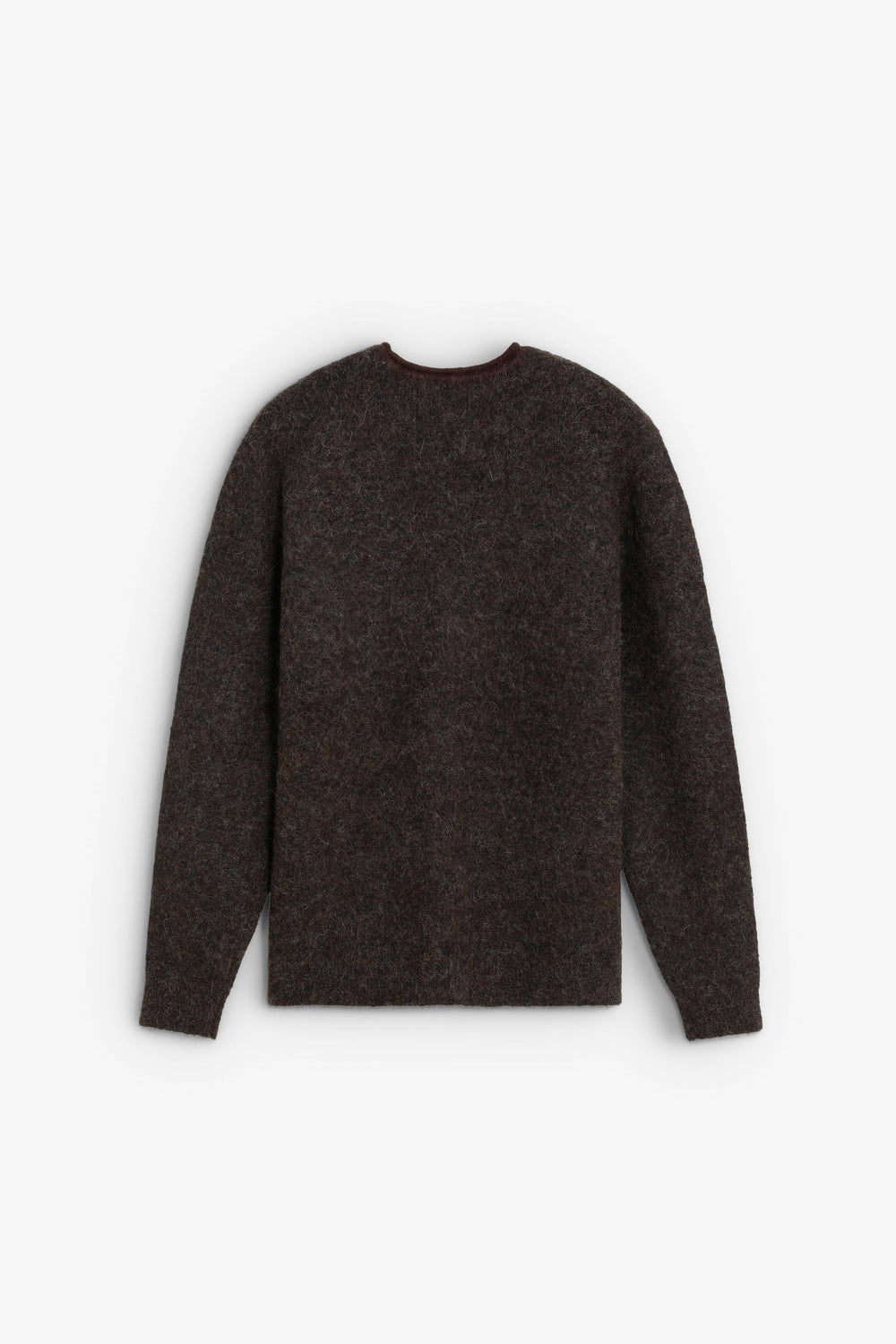 Alpaca vest. V-hals. Lange mouwen. Knoopsluiting voor. Twee zakken aan de voorkant. Label met logo aan de binnenkant.