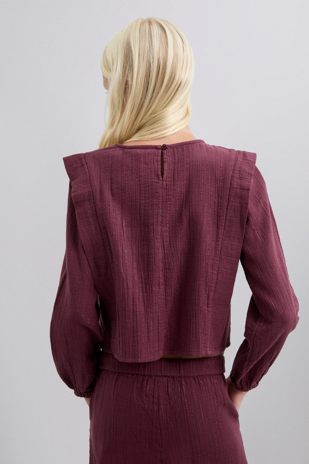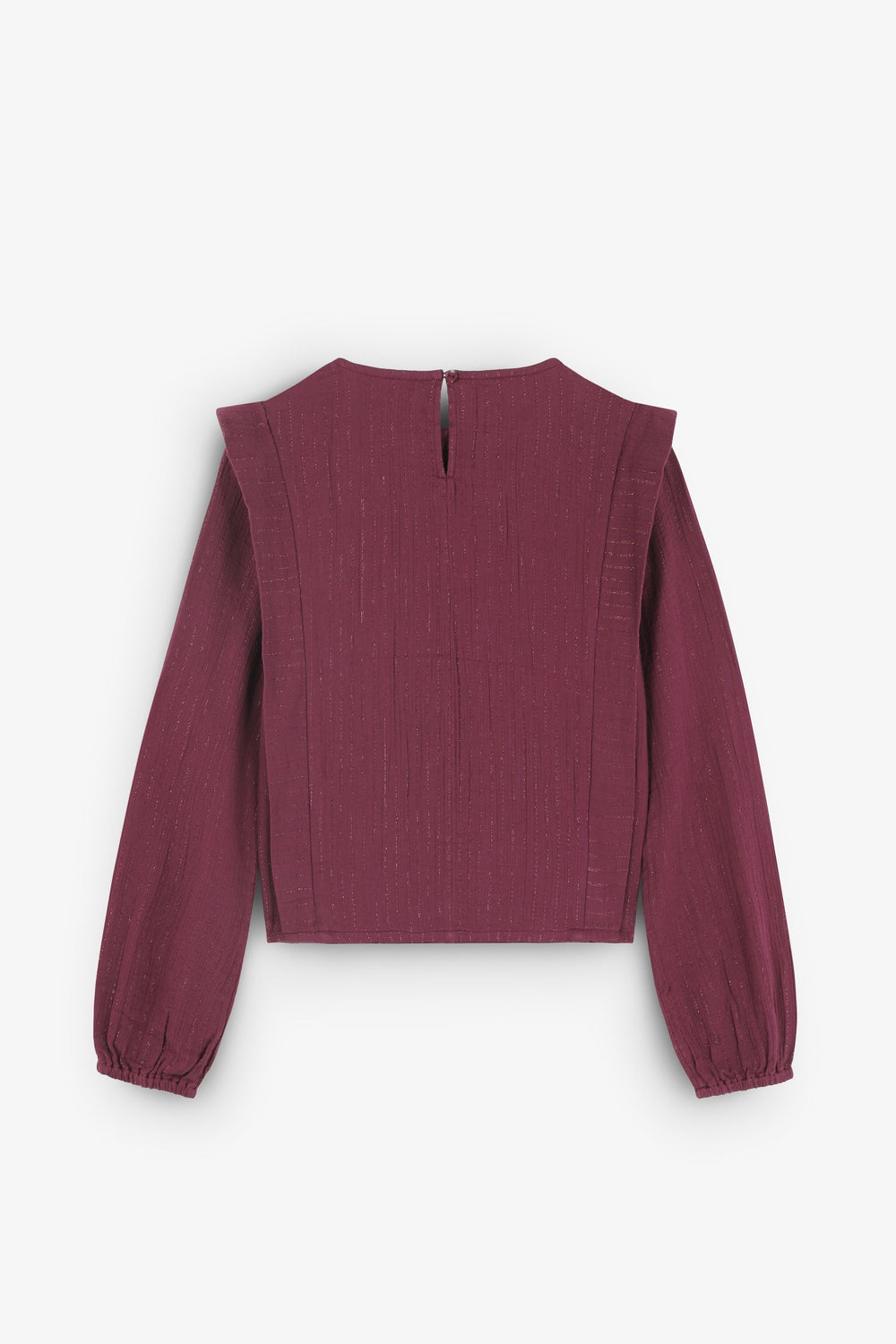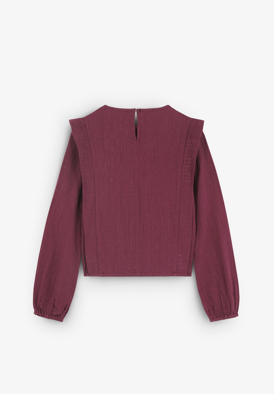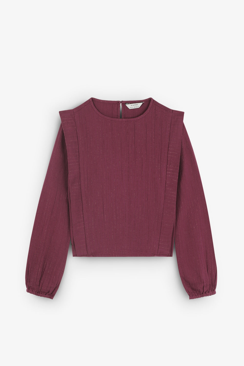 Blouse gemaakt van BCI-katoen. Ronde hals. Plooien aan de voorkant. Geribde details. Lange mouw. Elastische manchetten. Sluiting met knoop achter.