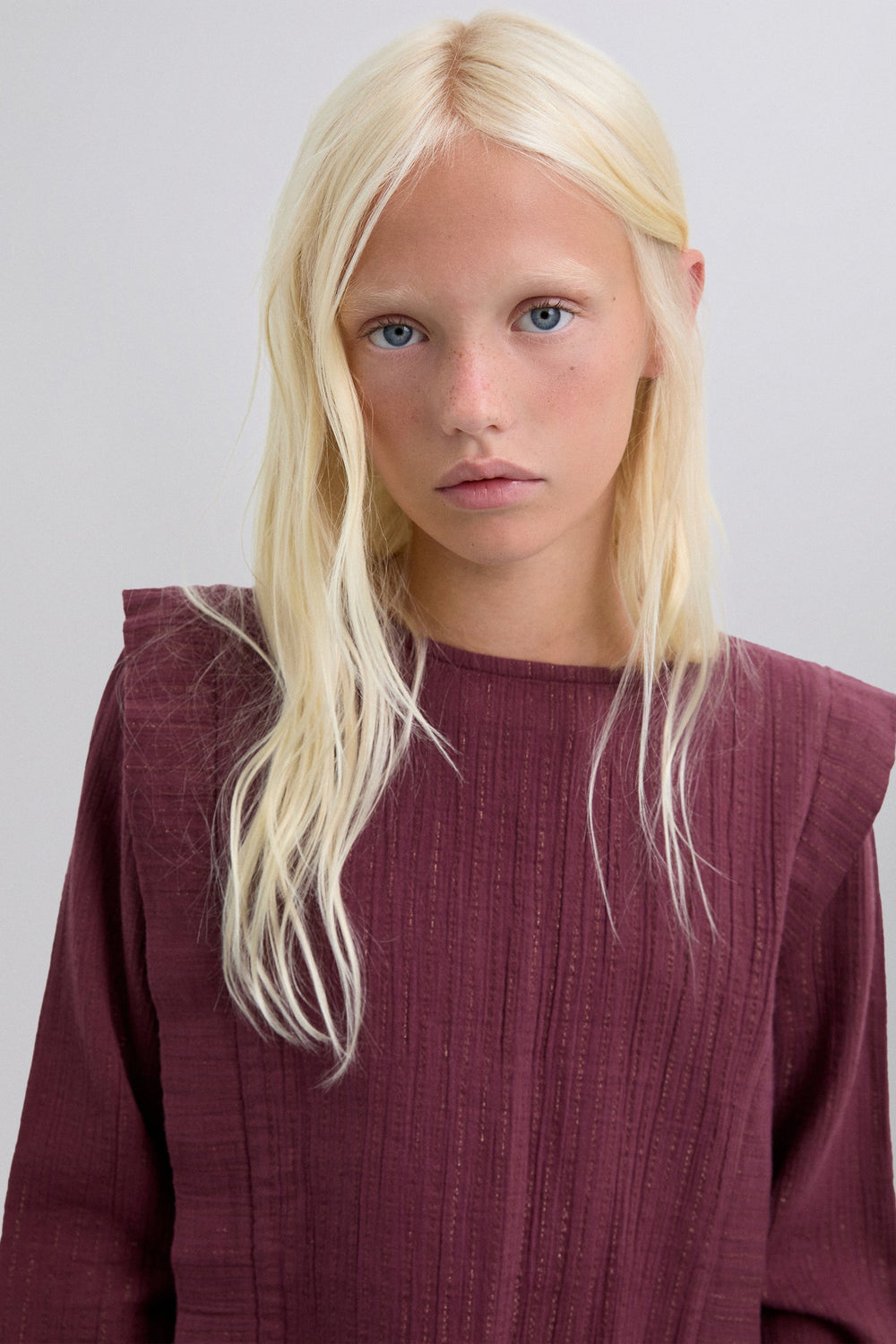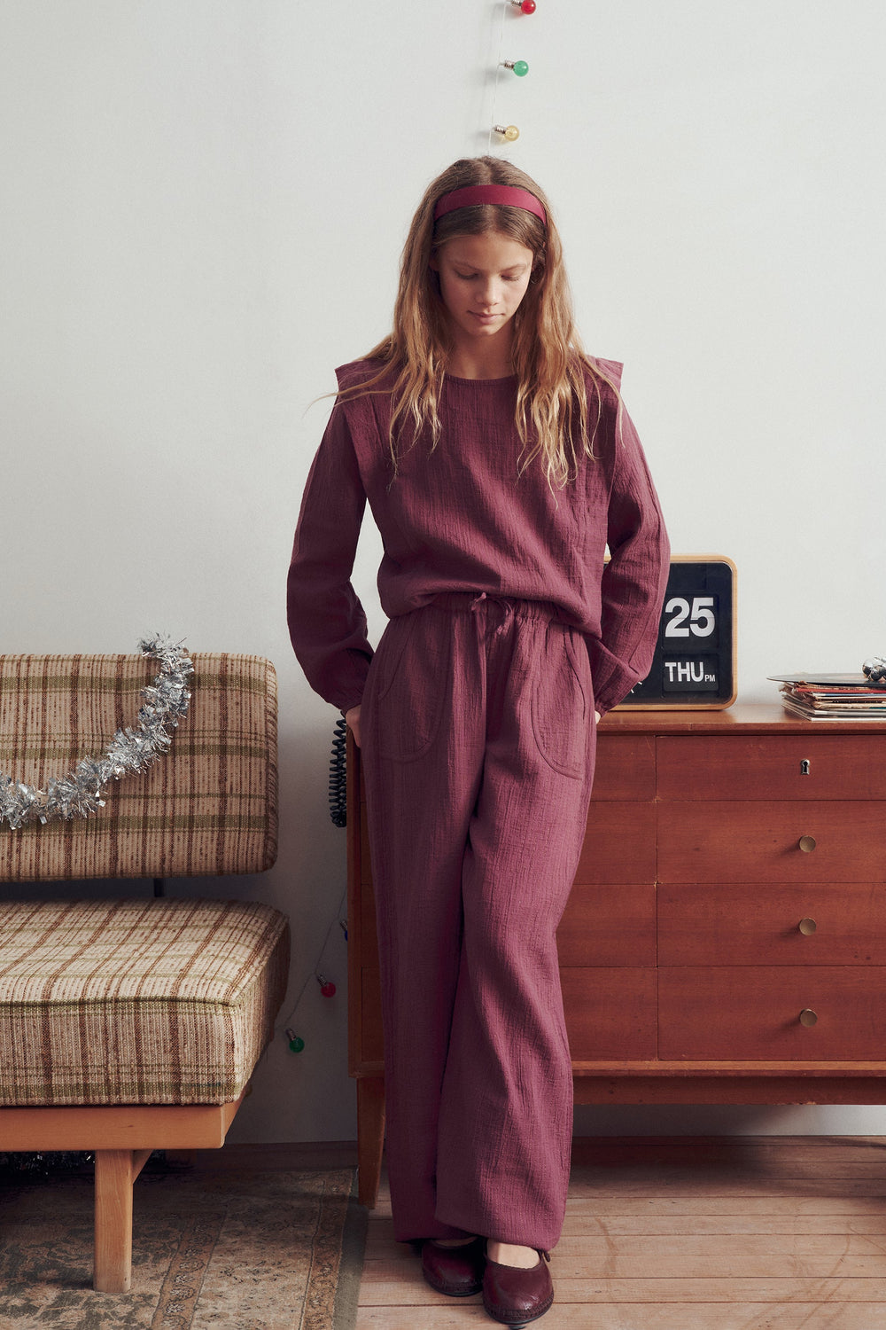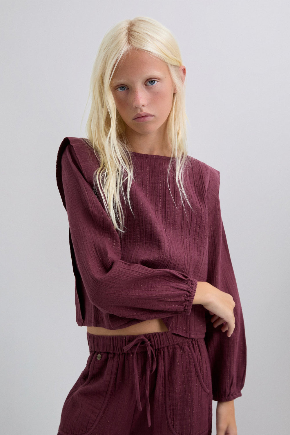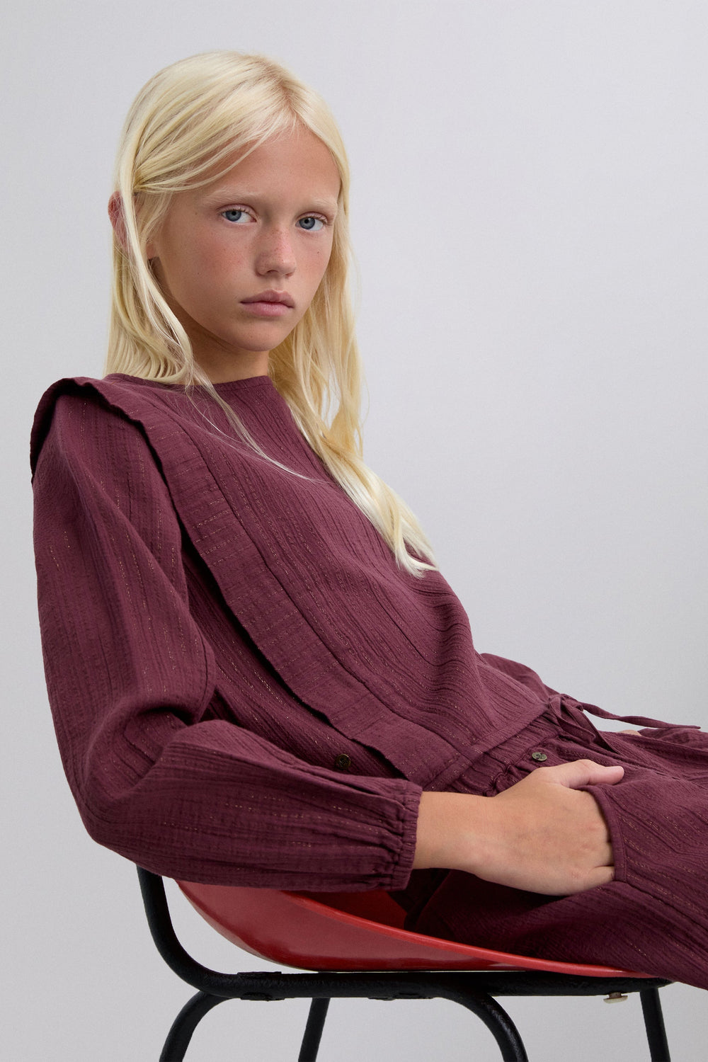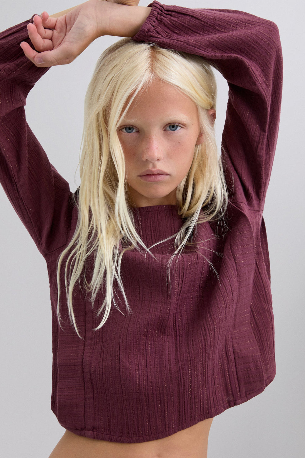 Blouse gemaakt van BCI-katoen. Ronde hals. Plooien aan de voorkant. Geribde details. Lange mouw. Elastische manchetten. Sluiting met knoop achter.