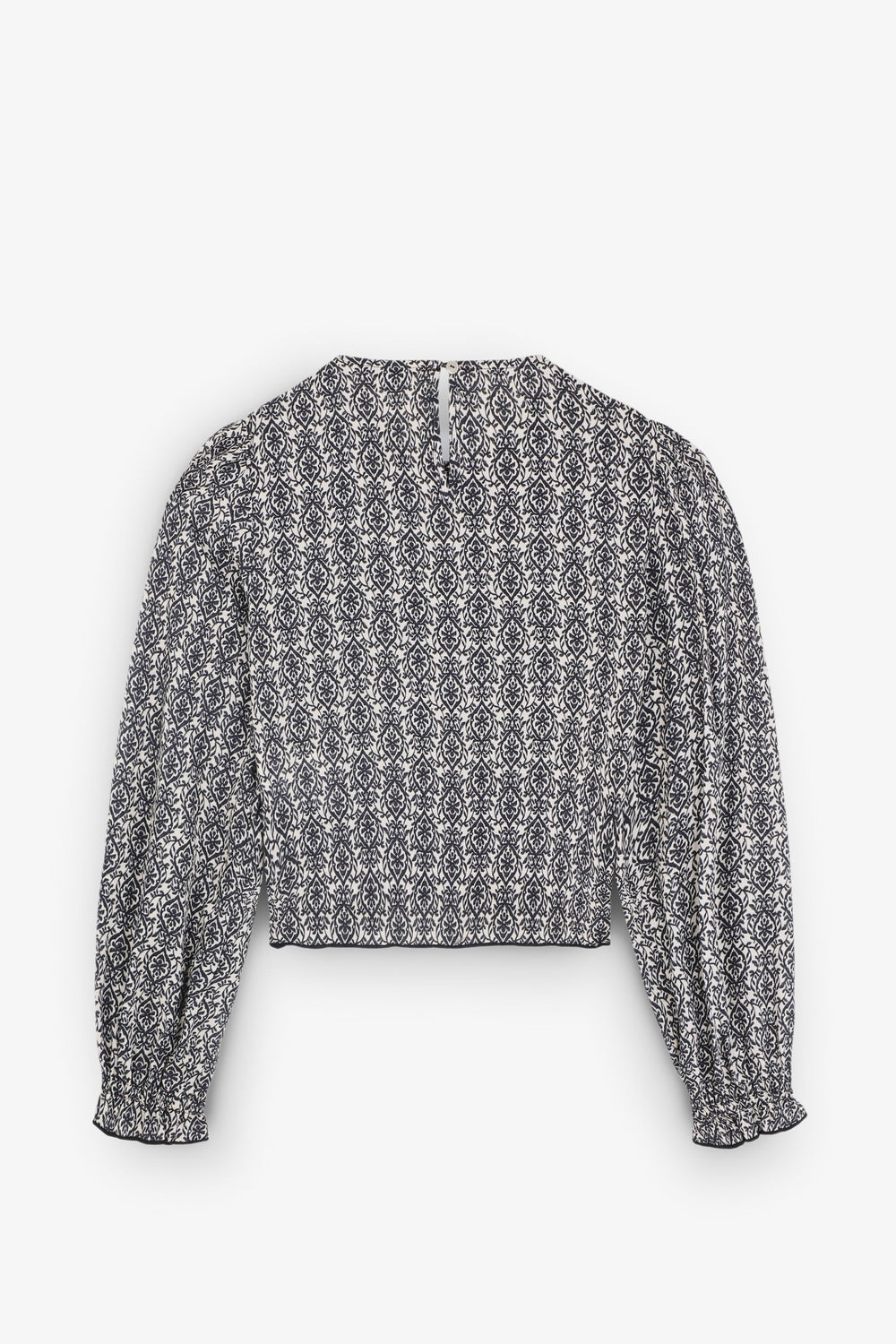 Blouse van 100% viscose met honingraatmotief. Regular fit, ronde hals en knoopsluiting achter. Lange ballonmouw met elastische manchet en volant op de zoom.