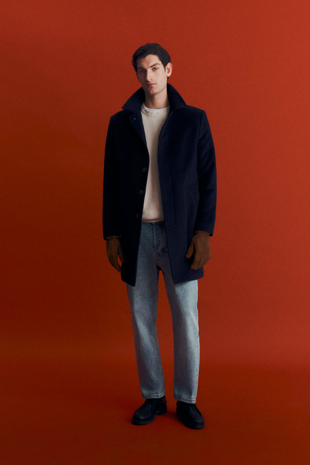 Coat made of Italian IN.TES.PRA wool blend fabric. Shirt collar. Long sleeves. Concealed front button fastening. Two side pockets.