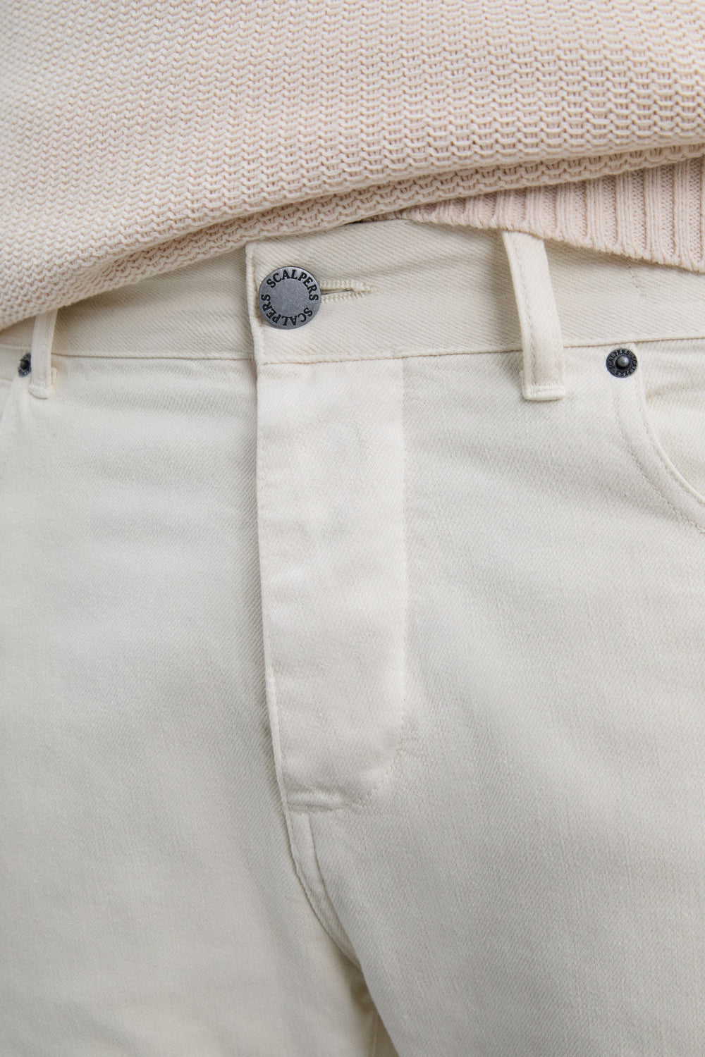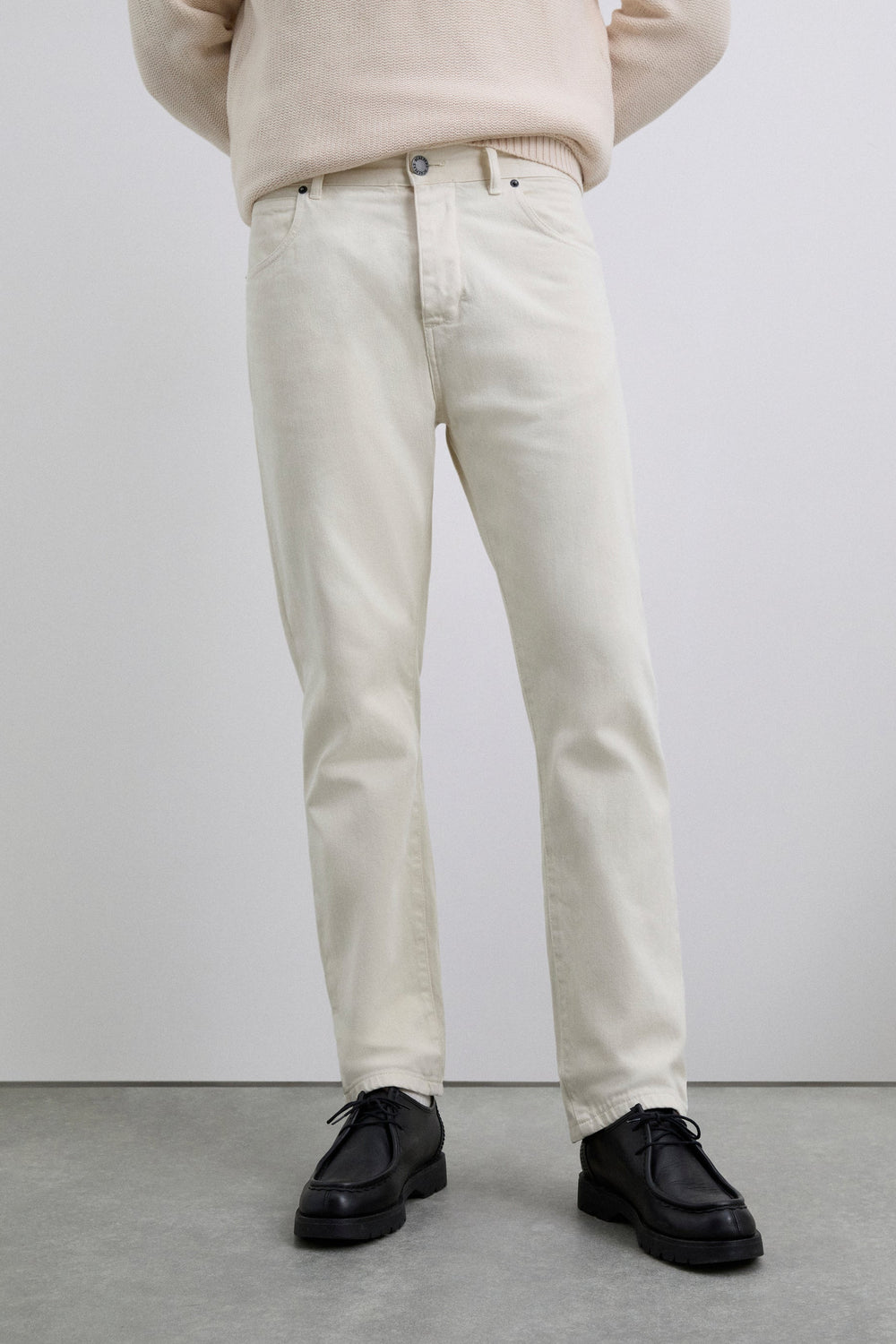 Rechte broek van 100% katoen. Voor- en achterzakken. Sluiting met rits en knoop. Riemlussen op de tailleband. Logolabels op tailleband en zak.